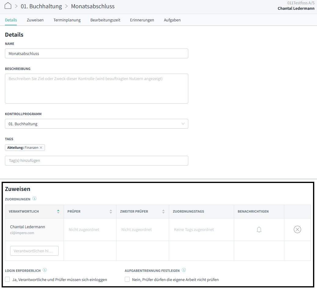 4) Die Zuordnungsdetails werden in einem Pop-up-Fenster angezeigt, nachdem Sie auf den ausgewählten Benutzer geklickt haben. Hier können Sie den Verantwortlichen bearbeiten und einen Prüfer sowie einen zweiten Prüfer zu der Kontrolle hinzufügen. Wenn Sie Zuordnungstags hinzufügen möchten, können Sie dies ebenfalls hier tun: