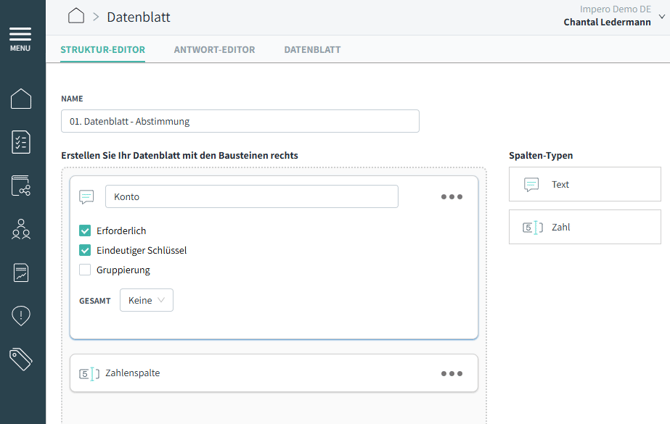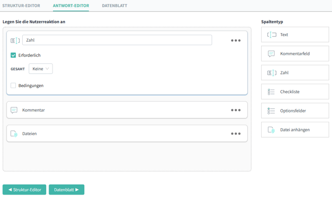 Im Antwort-Editor (Abbildung 4) werden die Antwortspalten für das Datenblatt definiert. Dies führt zu den Antwortfeldern, die von der Person ausgefüllt werden, die die Kontrolle durchführt. Es stehen dieselben Daten- und Spaltentypen zur Verfügung wie beim Erstellen einer Kontrolle: Text, Kommentarfeld, Zahl, Checkliste, Optionsfelder, Upload-Feld. Spalten können als Pflichtfelder („erforderlich“) festgelegt werden.