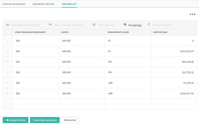 , die sich im unteren Bereich des Kontrollprogramms befindet, um ein neues Datenblatt zu erstellen. - Das Datenblatt wird mit einem Editor erstellt, der aus drei Komponenten besteht: Struktur-Editor, Antwort-Editor und Datenblatt.