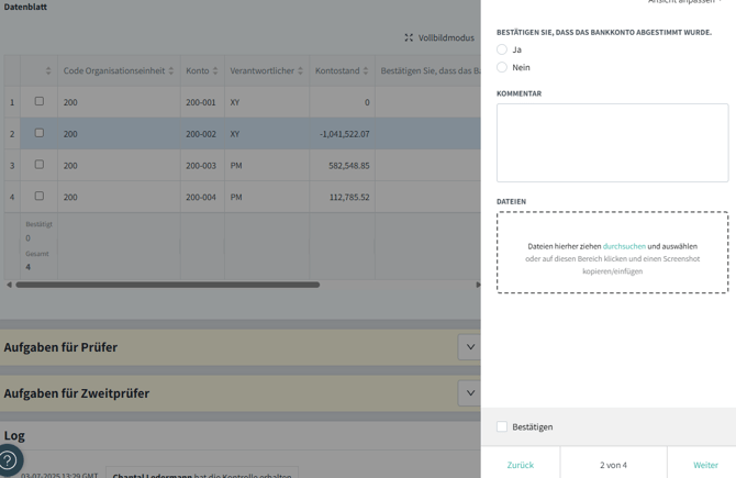 Wenn die für die Kontrolle zuständige Person auf jede Zeile des Bankkontos/der Daten klickt, öffnet sich rechts ein Fenster, in dem sie vordefinierte Fragen zu diesem bestimmten Konto beantworten kann. Anschließend kann sie auf „Weiter” klicken, um zum nächsten Konto zu gelangen.