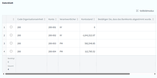 Ein Datenblatt für den Kontenabstimmung ist unten dargestellt (Abbildung 3). Das Bankkonto ist der eindeutige Schlüssel, der nur einmal im Datenblatt vorkommt. Für jedes Bankkonto sollte eine Überprüfung durchgeführt werden. Die Bankkonten sind nach der Gruppierungsdimension „Code Organisationseinheit” strukturiert. Jede verantwortliche Stelle erhält eine ausgewählte Liste der Bankkonten, die sie abgleichen muss.
