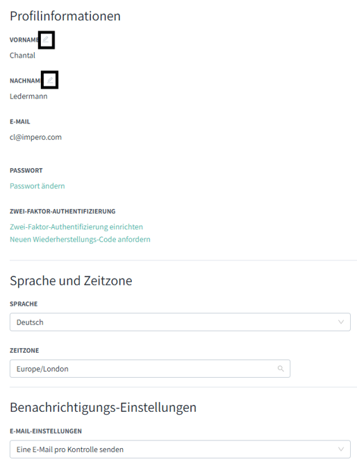 Hinweis: Wenn Sie die Sprache oder Zeitzone ändern, wirkt sich dies sowohl auf die Sprache und Uhrzeit der Impero-Lösung als auch auf die E-Mails aus, die Sie von Impero erhalten.
