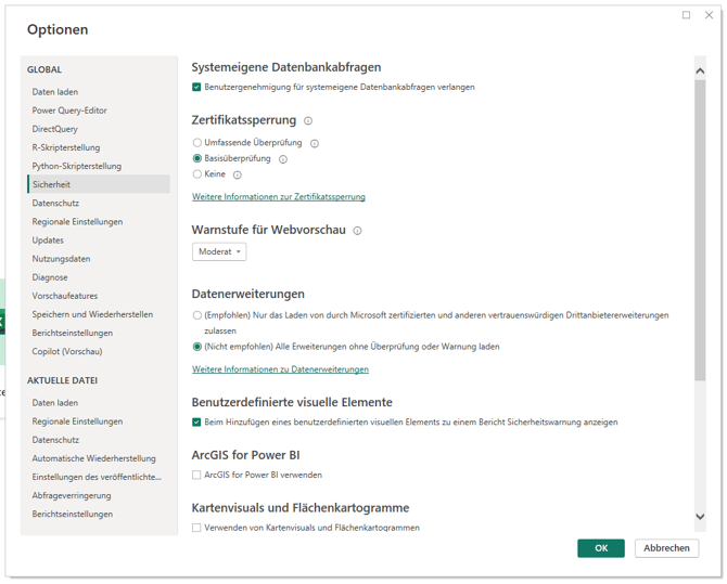 - Unter der Kategorie "Global", klicken Sie auf "Sicherheit" und wählen Sie dann unter Datenerweiterungen die Option "(Nicht empfohlen) Alle Erweiterungen ohne Überprüfung oder Warnung laden". Dieser Schritt ermöglicht das Laden des Custom Connectors.