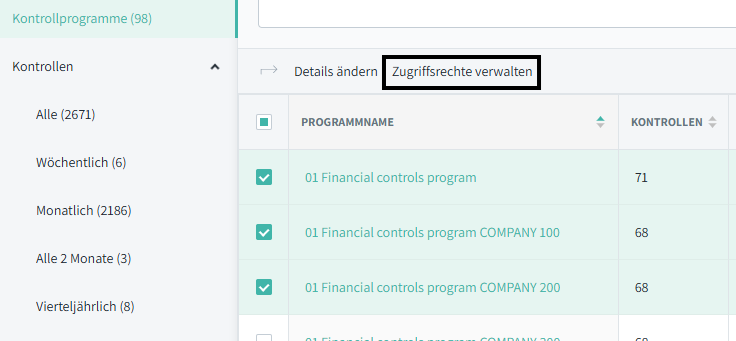 Der Zugriff wird auf Programmebene gewährt. Sie können den Zugriff für alle Programme individuell gewähren und so sicherstellen, dass nur relevante Nutzer Zugriff auf die Kontroll-Setups sowie die abgeschlossenen Kontrollen innerhalb des Programms erhalten.
