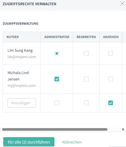 - Fügen Sie die Nutzer mit einer der drei Berechtigungsarten hinzu und klicken Sie auf „Aktualisieren“.