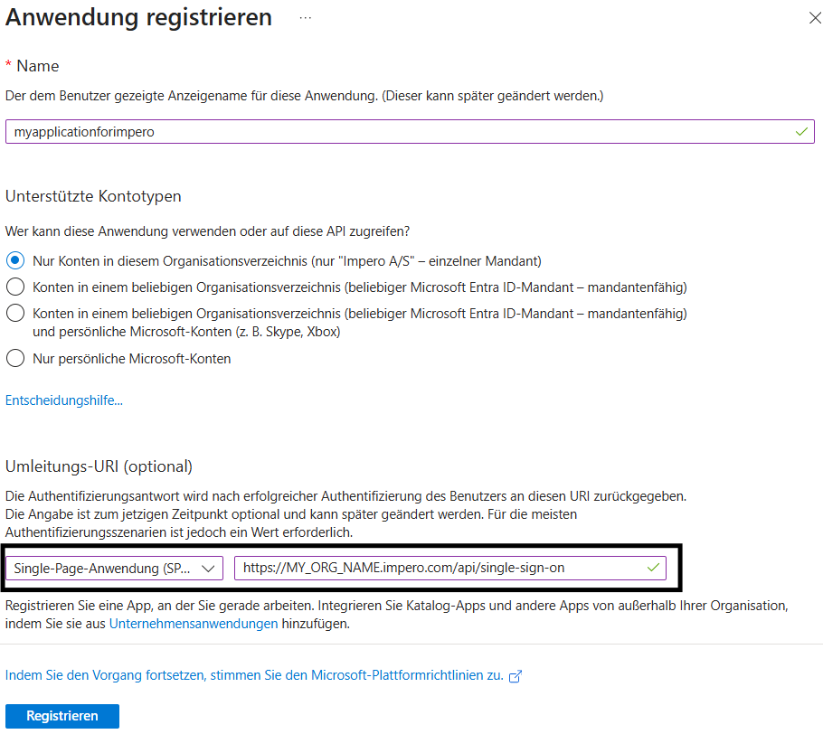 Für „Umleitungs-URI (optional)“ ist es trotz des Namens wichtig, den Anwendungstyp „Single-Page-Anwendung (SPA)“ und die URL im folgenden Format einzugeben: https://MY_ORG_NAME.impero.com/api/single-sign-on wobei „MY_ORG_NAME“ der Name Ihrer Organisation ist, mit der Sie auf Impero zugreifen. Wenn Sie noch keine haben oder nicht wissen, welche es ist, wenden Sie sich bitte an unseren Kundensupport: https://support.impero.com/knowledge/kb-tickets/new.