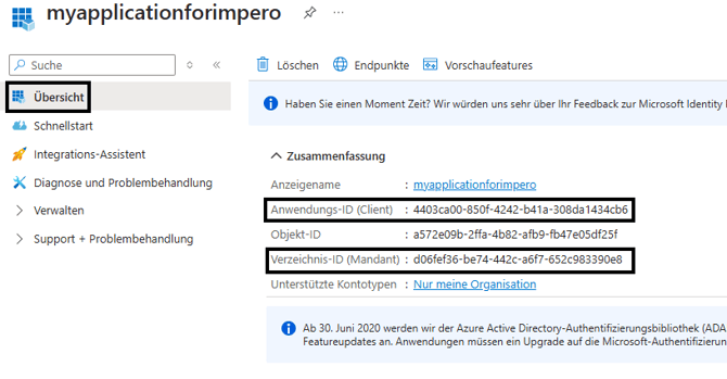 Sie können auf „Registrieren“ klicken und damit wird die Anwendung erstellt. - Im nächsten Schritt sollten einige Informationen an Impero versandt werden, damit wir Ihre Konfiguration in unserem System einbinden können. Gehen Sie zur Seite „Übersicht“ der soeben erstellten Anwendung und kopieren Sie die folgenden Informationen: „Anwendungs-ID (Client)“ und „Verzeichnis-ID (Mandant)". Schicken Sie dann bitte diese beiden Informationen an Ihren Ansprechpartner bei Impero. (Hinweis: Wir benötigen keine „Objekt-ID“ oder weiteren vertraulichen Informationen von Ihnen.)