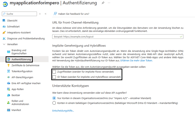 Vorsicht: Falls Sie eine Multi-Faktor-Authentifizierung mit Ausnahmen einrichten müssen, verwenden Sie bitte den impliziten Fluss anstelle des Authorization Flow. Außerdem müssen Sie ID-Tokens aktivieren, indem Sie das Kästchen „ID-Token (werden für implizite und Hybridflows verwendet)“ wie oben ankreuzen.