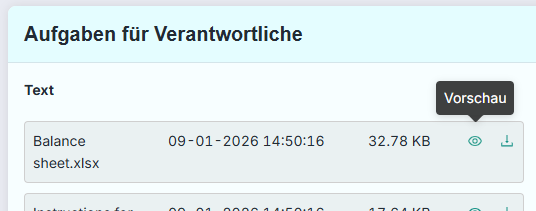 Es ist nun möglich, angehängte Excel- und CSV-Dateien direkt in der Plattform als Vorschau anzuzeigen, ohne sie zuvor herunterladen zu müssen. Dies gilt für die Durchführung von Kontrollen und Kontrolltests und erleichtert und beschleunigt die Bewertung von Dokumentationen, da die Dateien nicht mehr auf ein lokales Gerät heruntergeladen werden müssen.