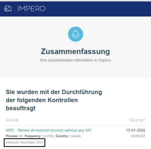 Wir haben unsere E-Mails zu Kontrollen und Kontrolltests verbessert, indem wir Informationen zum relevanten Zeitraum hinzugefügt haben. Dadurch wird deutlich, auf welchen Zeitraum sich eine Kontrolle oder ein Kontrolltest bezieht, was Unklarheiten reduziert und das Verständnis und die Bearbeitung von E-Mails erleichtert.
