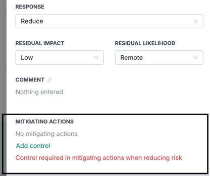 Risikomatrix-Konfiguration: Kontrollauswahl erforderlich, wenn die Risikoreaktion „Reduzieren“ gewählt wird