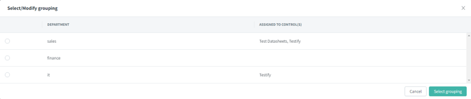 A grouping dimension must be selected to add the relevant part of the datasheet to a control. Before this, think who should be the responsible person for this control. Select the part of the datasheet using the grouping dimension that she/he needs to work on. The grouping selection can be done when clicking "Select grouping" (Figure 7). Afterwards a pop-up with the selections will appear (Figure 8). The rest of the datasheet will not be shown to her/him. To send different parts of the datasheet to different responsibles, create multiple controls with an assignee each.