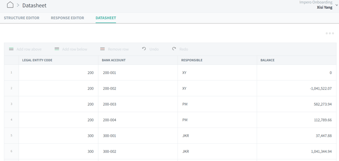 A Datasheet for bank reconciliation is shown below (Figure 3). Bank account is the unique key, which only exists once in the datasheet. For each bank account, a check should be conducted. The bank accounts are structured by the grouping dimension legal entity code. Each entity responsible receives a selected list of bank accounts that he/she needs to reconcile.