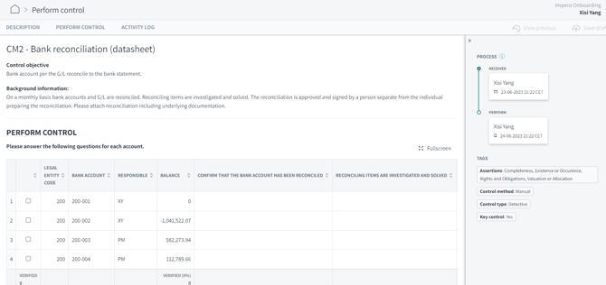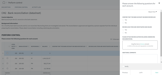 When the control responsible clicks on each of the bank account / data row, a small window will pop up on the right where she can answer pre-defined questions on that specific account. Then, she can click on "Next" to go to the next account.