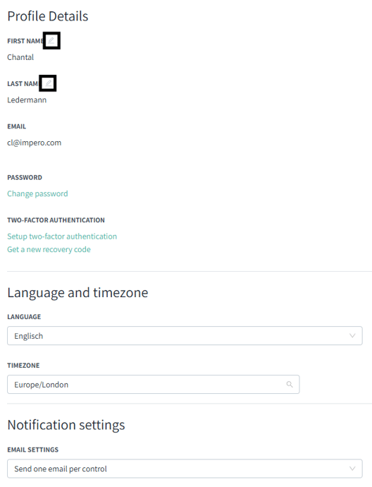 - You can change your master data. If you have an administrator role, you can e.g. change first name, last name and email.